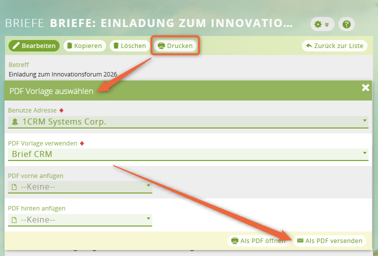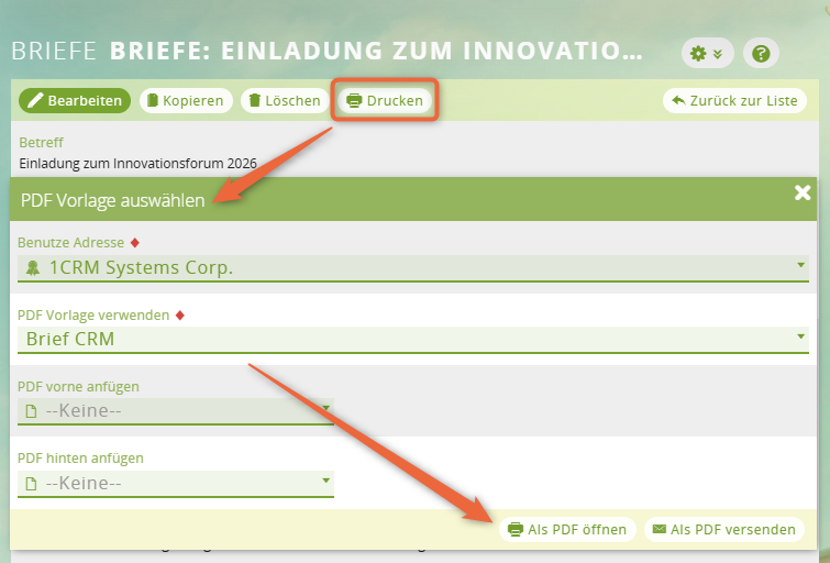 Klicken Sie in der Brief-Ansicht auf die Schaltfläche Drucken. Wählen Sie unter Benutze Adresse, welche Firmenadresse von Ihnen im Brief erscheinen soll. Wählen Sie unter PDF Vorlage verwenden die gewünschte PDF-Vorlage. Klicken Sie anschließend auf Als PDF öffnen: