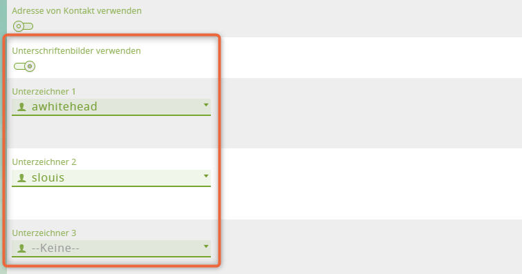 Sie können bis zu 3 Unterschriften von Benutzern einfügen. Aktivieren Sie dafür die Einstellung Unterschriftenbilder verwenden und wählen Sie die gewünschten Unterzeichner: