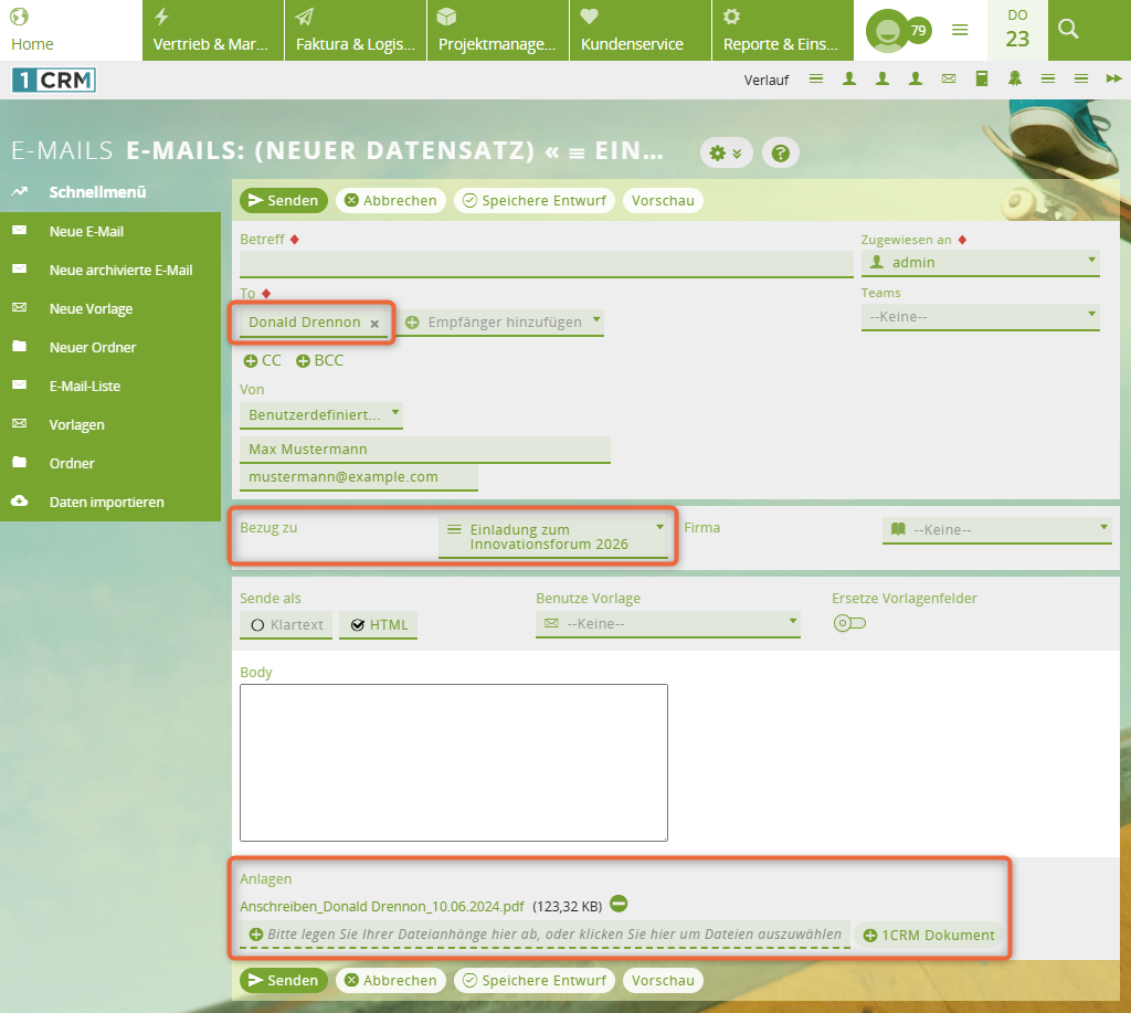 Geben Sie den Betreff der E-Mail ein und weitere Daten nach Bedarf. Beachten Sie, dass einige Informationen wie z. B. der Empfänger aus dem Brief übernommen wurden. Außerdem ist die PDF-Datei des Briefes als Anhang angefügt: