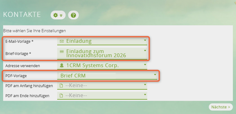 Hinterlegen Sie die zuvor erstellten Text- und Briefvorlagen, wählen Sie eine PDF-Vorlage und klicken Sie auf Nächste: