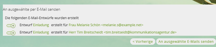 Es wurden automatisch Entwürfe für Ihre E-Mails erstellt. Klicken Sie auf den Link hinter Entwurf und der Entwurf für Ihre E-Mail wird geöffnet. Über die Schieberegler haben Sie die letzte Möglichkeit, Kontakte aus dem Versand zu entfernen.