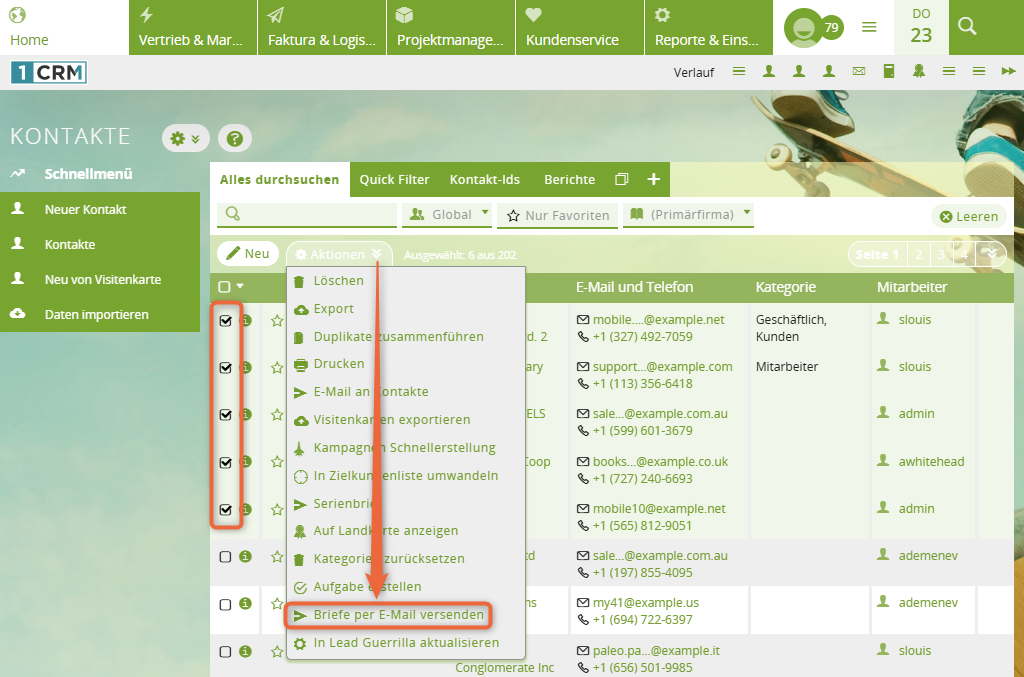 Öffnen Sie die Ansicht Kontakte. Setzen Sie links Häkchen bei den Kontakten, an die Sie die Briefe per E-Mail versenden möchten. Wählen Sie unter Aktionen die Option Briefe per Mail versenden: