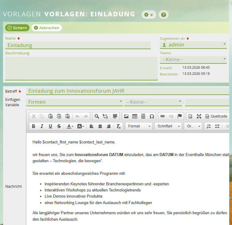 Erstellen Sie den Inhalt für Ihre Briefvorlage. Sie können wie gewohnt Platzhalter nutzen, z. B. für die Anrede. Sowohl Text als auch Betreff werden später für einen Brief übernommen: