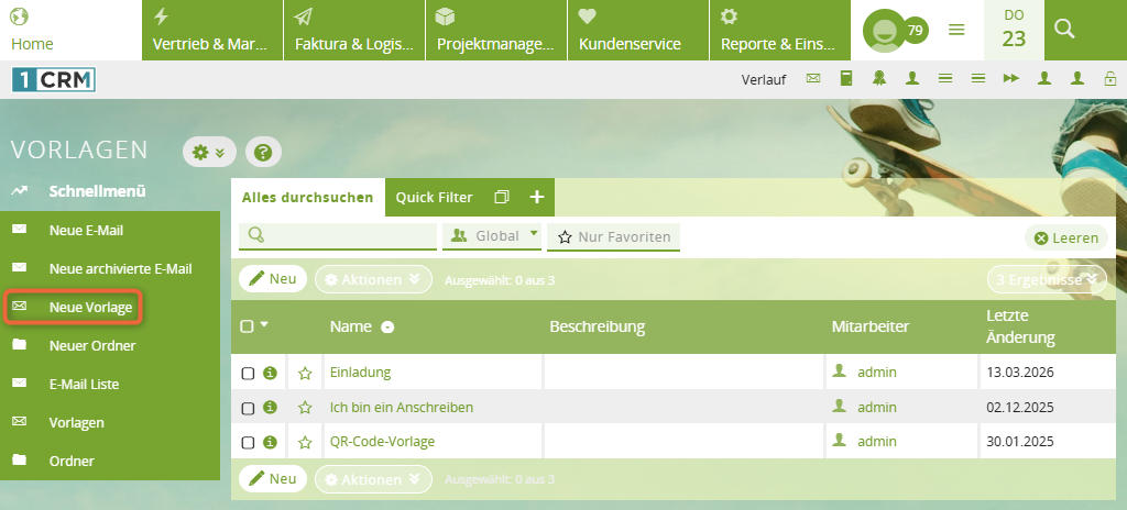 Klicken Sie auf Home > E-Mails und wählen Sie im Schnellmenü die Option Neue Vorlage: