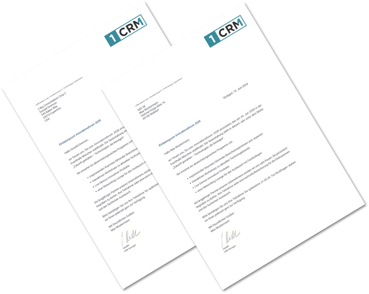 Passen Sie nach Bedarf die Vorlage für den Brief an. In diesem Beispiel müssen Sie ein konkretes Datum im Betreff und im Text eintragen. Standardmäßig wird die Firmenadresse in der PDF-Datei des Briefes eingefügt. Wenn Sie die Adresse des Kontakts einfügen möchten, aktivieren Sie die Einstellung Adresse von Kontakt verwenden.