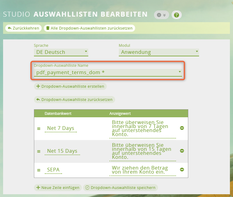 Klicken Sie in der Administration auf Dropdown-Auswahllisten verwalten und wählen Sie die Dropdown-Liste PDF_payment_terms_dom.