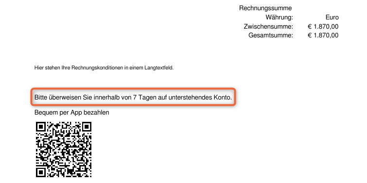 Sie können Zusatztext zu den Zahlungskonditionen in Ihren Rechnungs-PDFs anzeigen lassen, wie z. B. "Bitte überweisen Sie innerhalb von 7 Tagen auf unterstehendes Konto".